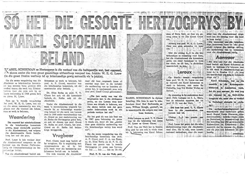 - Só het die gesogte Hertzogprys by Karel Schoeman beland