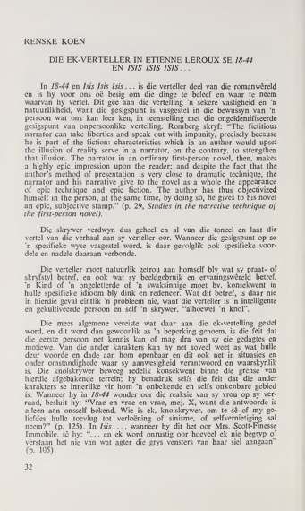 - Koen, R. 1976. Die ek-verteller in Etienne Leroux se 18-44 en Isis Isis Isis. Tydskrif vir Letterkunde. 14(20:32-40.