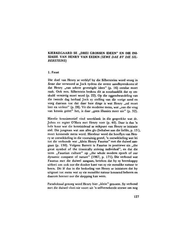 - Venter, L.S. 1977. Kierkegaard se "Drei grossen ideen" en die inisiasie van Henry van Eeden (Sewe dae by die Silbersteins). Koers. 42(2);127-137. 10.4102/koers.v42i2.1202