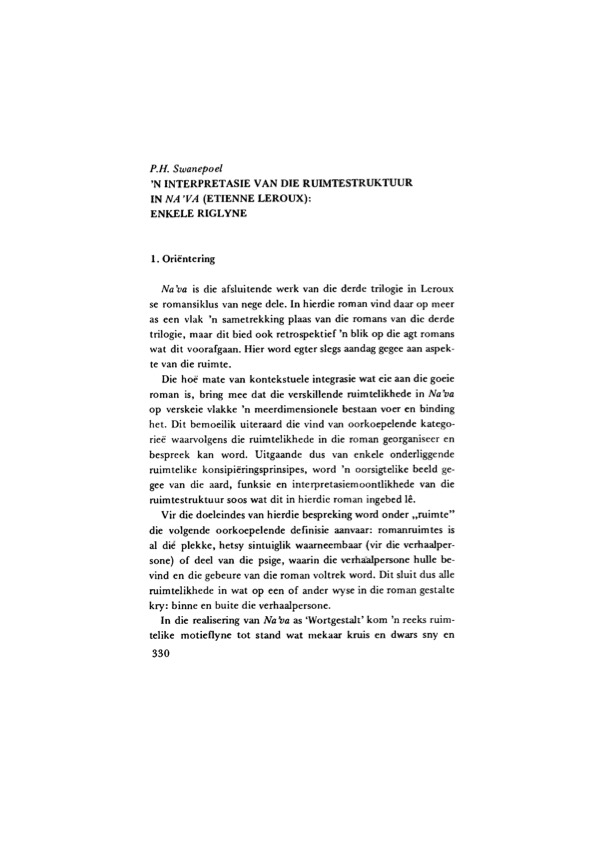- Swanepoel, P. (1977). ’n Interpretasie van die ruimtestruktuur in na ’va (Etienne le Roux): enkele riglyne. Koers - Bulletin for Christian Scholarship/Bulletin vir Christelike Wetenskap, 42(5), 330-350. doi:https://doi.org/10.4102/koers.v42i5.1218