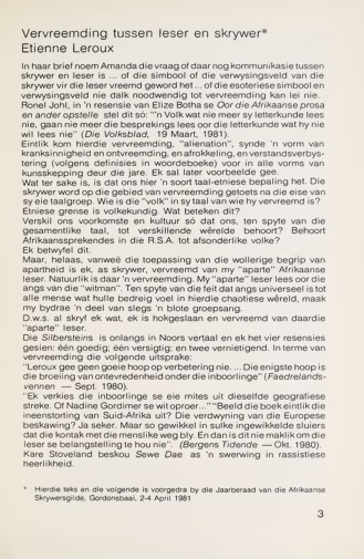 - Leroux, E. (1981). Vervreemding tussen leser en skrywer. In C. Malan, & B. Smit (Eds.), Skrywer en Gemeenskap: Tien jaar Afrikaanse skrywersgilde (pp.75-79)