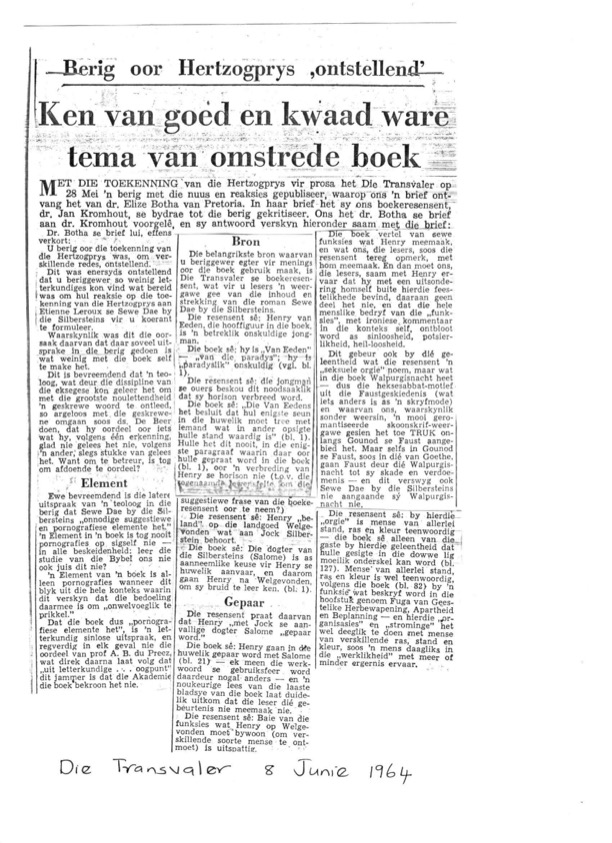 - Berig oor Hertzogprys 'ontstellend': Ken van goed en kwaad ware tema van omstrede boek