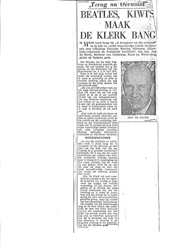 'Terug na die oerwoud': Beatles, Kiwi's maak De Klerk bang